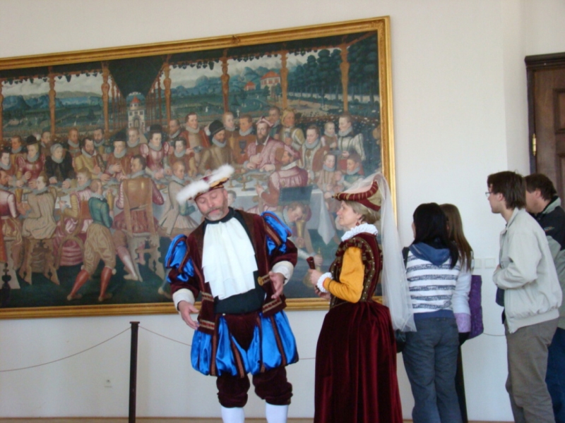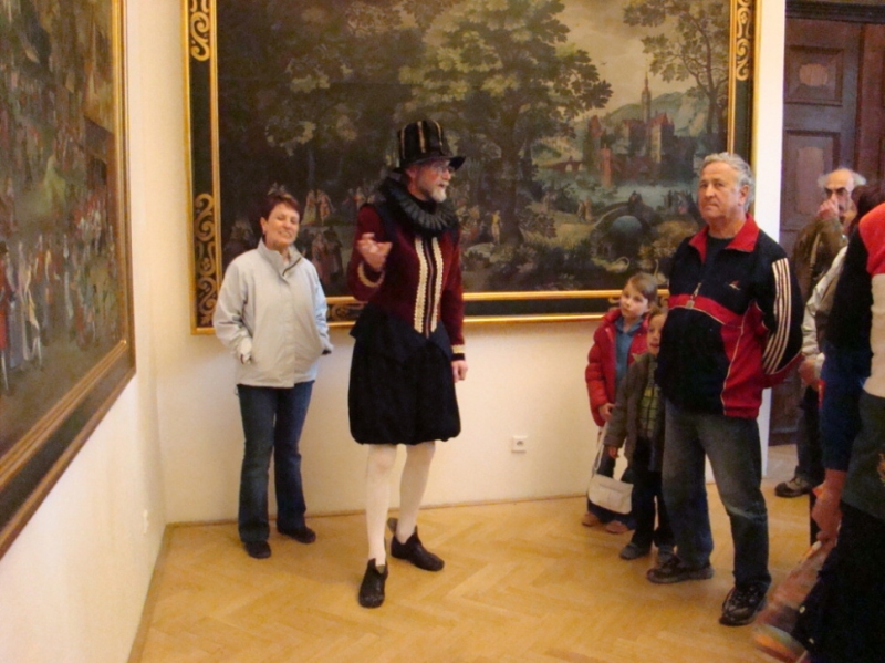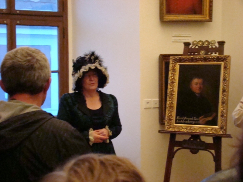 Hned v prvním sále uvítali všechny zúčastněné renesančně odění šlechtici z rodu Hohenemsů. Představil se samotný Jakub Hannibal I. se svou chotí Hortensií a rovněž jejich syn Kašpar. V dalším sále se o slovo přihlásili umělci v dobových kostýmech coby autoři vystavených galerijních děl. O svém uměleckém talentu se rozpovídal sochař a poličský rodák Vojtěch Eduard Šaff. Terézie Machková, manželka malíře Antonína Machka, přiblížila, jaký byl život po boku jednoho z nejznámějších portrétistů 19. století. S postupy při vytváření rytin návštěvníky seznámil dvorní rytec hraběte Šporka Michael Jindřich Rentz.