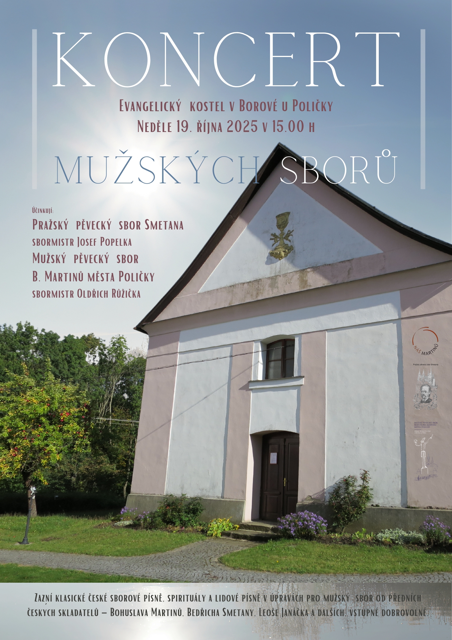 Koncert se koná v neděli 19. října 2025 od 15.00 hod. v Evangelickém kostele v Borové u Poličky. Vstupné dobrovolné.