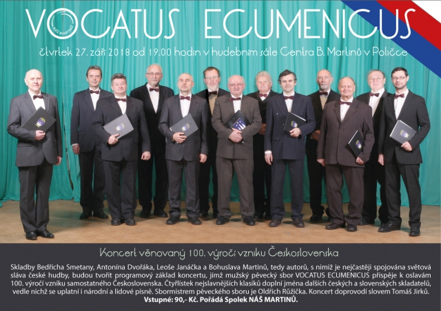 Skladby Bedřicha Smetany, Antonína Dvořáka, Leoše Janáčka a Bohuslava Martinů, tedy autorů, s nimiž je nejčastěji spojována světová sláva české hudby, budou tvořit programový základ koncertu, jímž mužský pěvecký sbor VOCATUS ECUMENICUS přispěje k oslavám 100. výročí vzniku samostatného Československa. Čtyřlístek nejslavnějších klasiků doplní jména dalších českých a slovenských skladatelů, vedle nichž se uplatní i národní a lidové písně. Sbormistrem pěveckého sboru je Oldřich Růžička. Koncert doprovodí slovem Tomáš Jirků.
