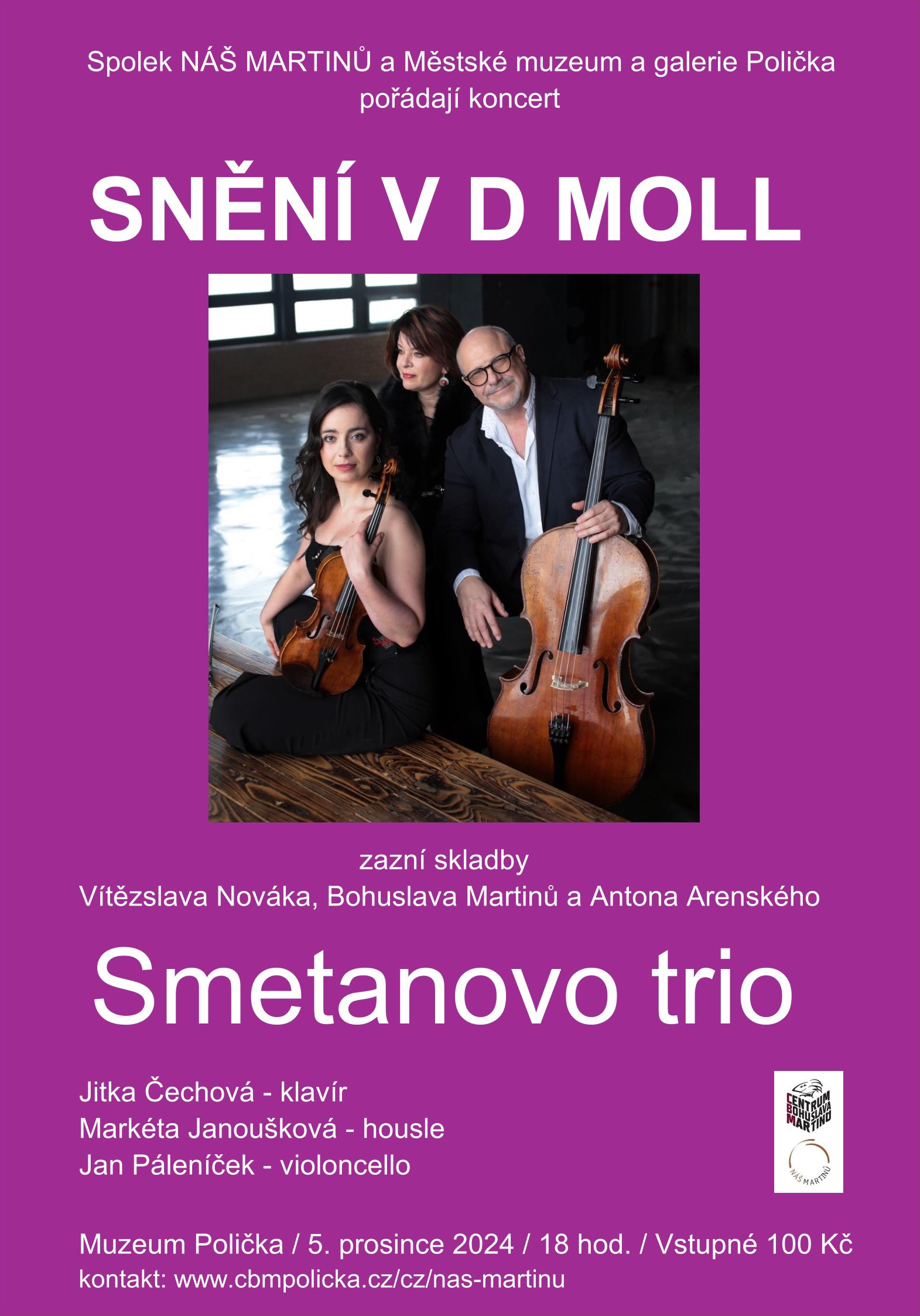 Smetanovo trio, založené legendárním českým klavíristou Josefem Páleníčkem, patří k nejprestižnějším českým souborům současnosti a v letošním roce slaví 90 let své existence. Na koncertu zazní tyto skladby: Vítězslav Novák: Trio d moll - quasi una ballata, op. 27, Bohuslav Martinů: Trio d moll, H. 327, Anton Arenskij: Trio d moll, op. 32.
